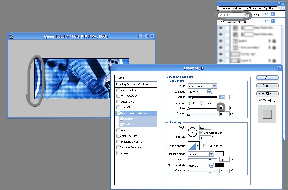 עכשיו תלחצו על כל מקום עם הסמן בשביל להעלים את הסימון, ומזל טוב! יש לכם עיגול מדליק כזה :) עכשיו במקרה של החתימה הזאת עשיתי ככה, הלכתי <כחול>Blending Options</כחול>, והוספתי ללייר <אדום>Bevel</אדום> על גודל אפס, ושיניתי את המצב של הלייר <כחול>Overlay</כחול>: